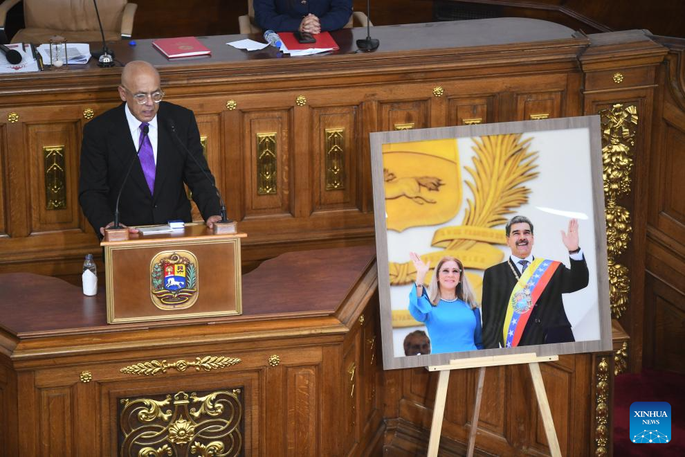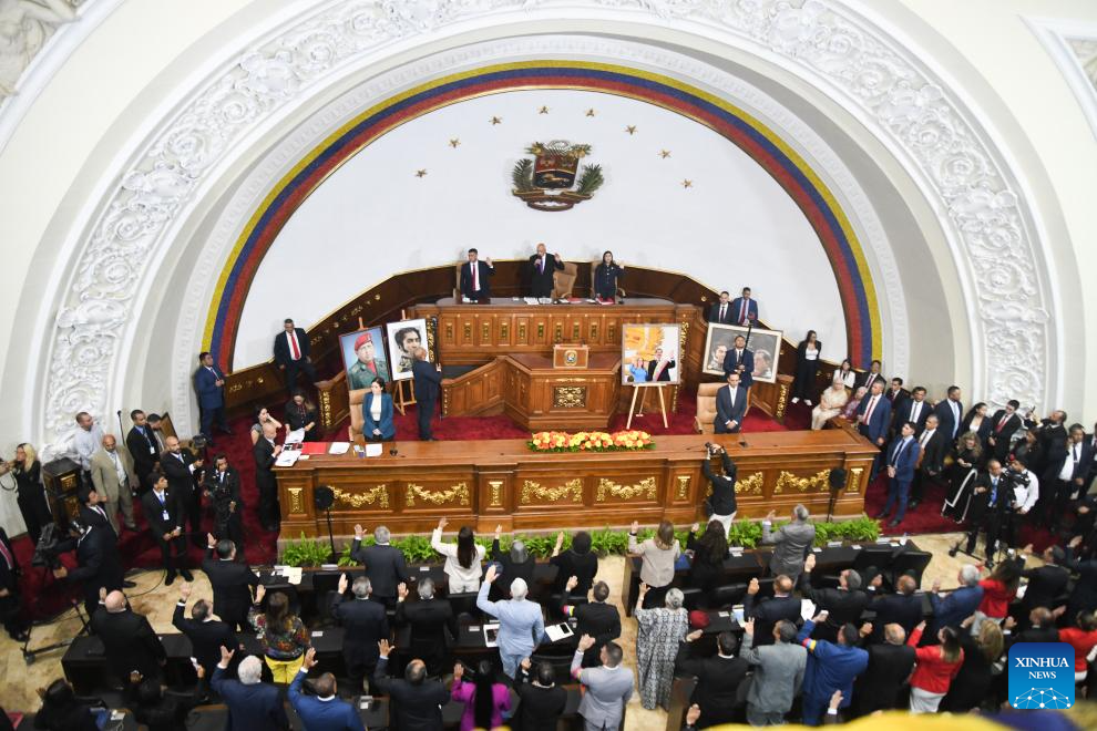 Diputados de la Asamblea Nacional venezolana prestan juramento durante una sesión en el Palacio Federal Legislativo, en Caracas, Venezuela, el 5 de enero de 2026. El presidente de la Asamblea Nacional de Venezuela, Jorge Rodríguez, aseguró el lunes que utilizará todas las instancias y espacios disponibles para lograr el regreso del jefe de Estado, Nicolás Maduro, y de la primera dama, Cilia Flores, capturados el pasado sábado por fuerzas armadas estadounidenses. (Xinhua/Marcos Salgado)
