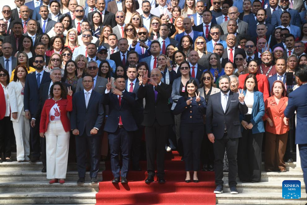 Diputados posan para una fotografía después de una sesión en el Palacio Federal Legislativo, en Caracas, Venezuela, el 5 de enero de 2026. El presidente de la Asamblea Nacional de Venezuela, Jorge Rodríguez, aseguró el lunes que utilizará todas las instancias y espacios disponibles para lograr el regreso del jefe de Estado, Nicolás Maduro, y de la primera dama, Cilia Flores, capturados el pasado sábado por fuerzas armadas estadounidenses. (Xinhua/Marcos Salgado)