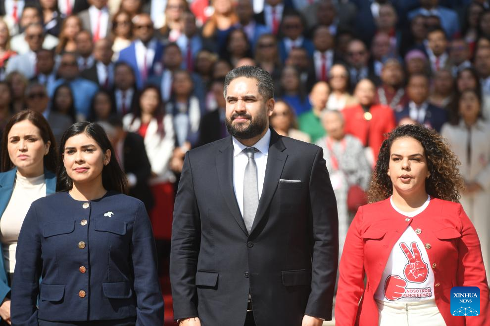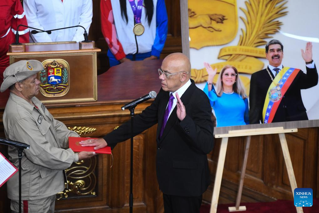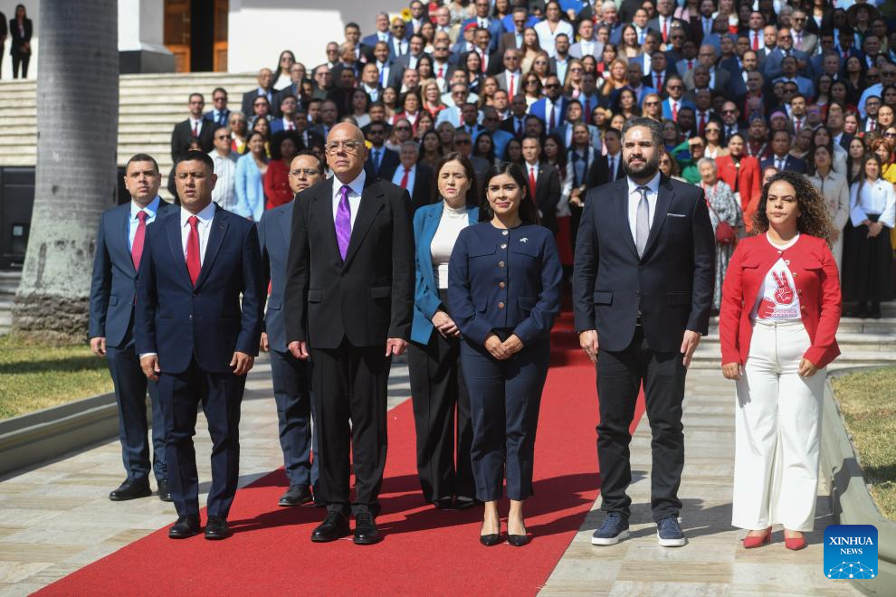 El presidente de la Asamblea Nacional de Venezuela, Jorge Rodríguez (2-i-frente), participa en una ceremonia después de una sesión en el Palacio Federal Legislativo, en Caracas, Venezuela, el 5 de enero de 2026. Rodríguez aseguró el lunes que utilizará todas las instancias y espacios disponibles para lograr el regreso del jefe de Estado, Nicolás Maduro, y de la primera dama, Cilia Flores, capturados el pasado sábado por fuerzas armadas estadounidenses. (Xinhua/Marcos Salgado)