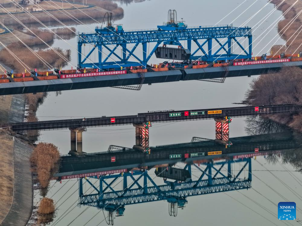 NANJING, 9 enero, 2026 (Xinhua) -- Vista aérea tomada con un dron el 8 de enero de 2026 del sitio de construcción del puente atirantado sobre el río Chuhe, en Nanjing, en la provincia de Jiangsu, en el este de China. Como parte de un ferrocarril de alta velocidad que une Shanghai, Nanjing de la provincia de Jiangsu, y Hefei de la provincia de Anhui, el puente atirantado sobre el río Chuhe completó su cierre el jueves. (Xinhua/Li Bo)