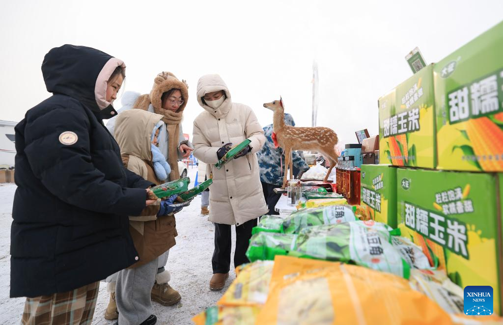 QIQIHAR, 12 enero, 2026 (Xinhua) -- Una vendedora promociona productos locales especializados entre los turistas en un mercado de un festival de acampada, en la ciudad de Qiqihar, en la provincia de Heilongjiang, en el noreste de China, el 12 de enero de 2026. El festival de acampada de una semana de duración se inauguró aquí el lunes, donde los entusiastas de acampar y los turistas de toda China pueden experimentar el encanto único de acampar y las costumbres populares locales en un frío gélido. (Xinhua/Xu Shuai)