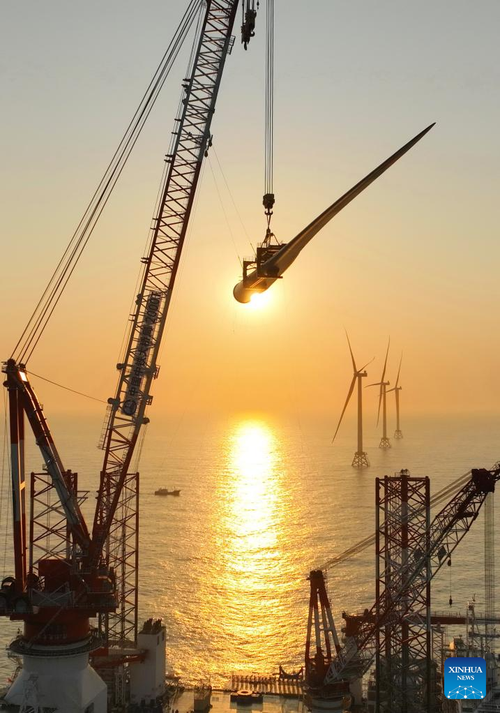 ZHANGZHOU, 13 enero, 2026 (Xinhua) -- Imagen tomada con un dron el 13 de enero de 2026 de una de las palas de la turbina siendo levantada en el sitio de construcción de una unidad de turbina eólica marina de 20 megavatios en las aguas costeras de la provincia de Fujian, en el sureste de China. La unidad de turbina eólica fue levantada e instalada con éxito aquí el martes. (Xinhua/Lin Shanchuan)