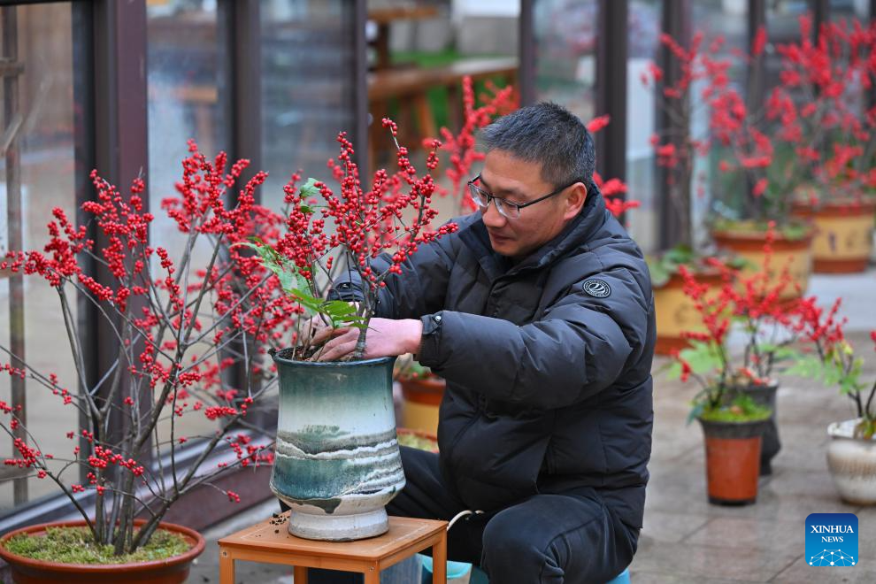 ZHOUNING, 15 enero, 2026 (Xinhua) -- Imagen del 14 de enero de 2026 de un gerente arreglando un bonsái de acebo, en el poblado de Puyuan del distrito de Zhouning, en la provincia de Fujian, en el sureste de China. Con la llegada del Festival de la Primavera, el mercado de flores de gran altitud y resistentes al frío ha experimentado un crecimiento constante. (Xinhua/Jiang Kehong)