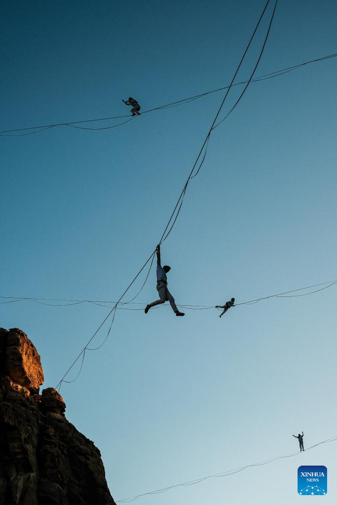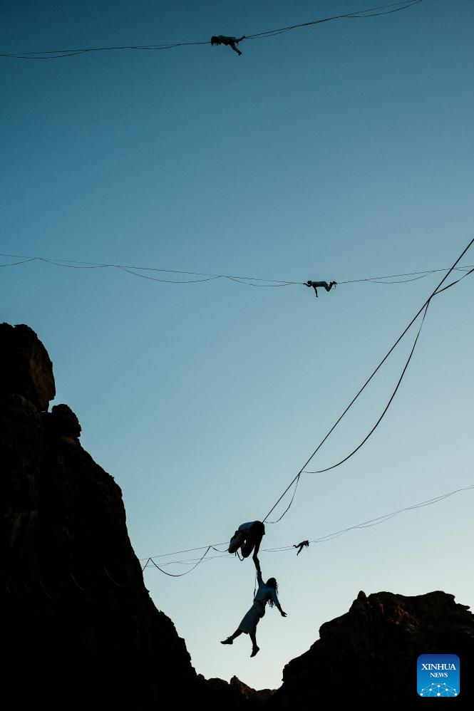 ALULA, 17 enero, 2026 (Xinhua) -- Imagen del 16 de enero de 2026 de acróbatas presentando un espectáculo de arte aéreo titulado Vértigo, en AlUla, Arabia Saudita. Presentado originalmente en París, Vértigo combina highlining, acrobacias y música inmersiva para explorar la gravedad, la autotrascendencia y el poder de la solidaridad a través de la interacción dinámica de los artistas con el espacio. (Xinhua/Xin Mengchen)