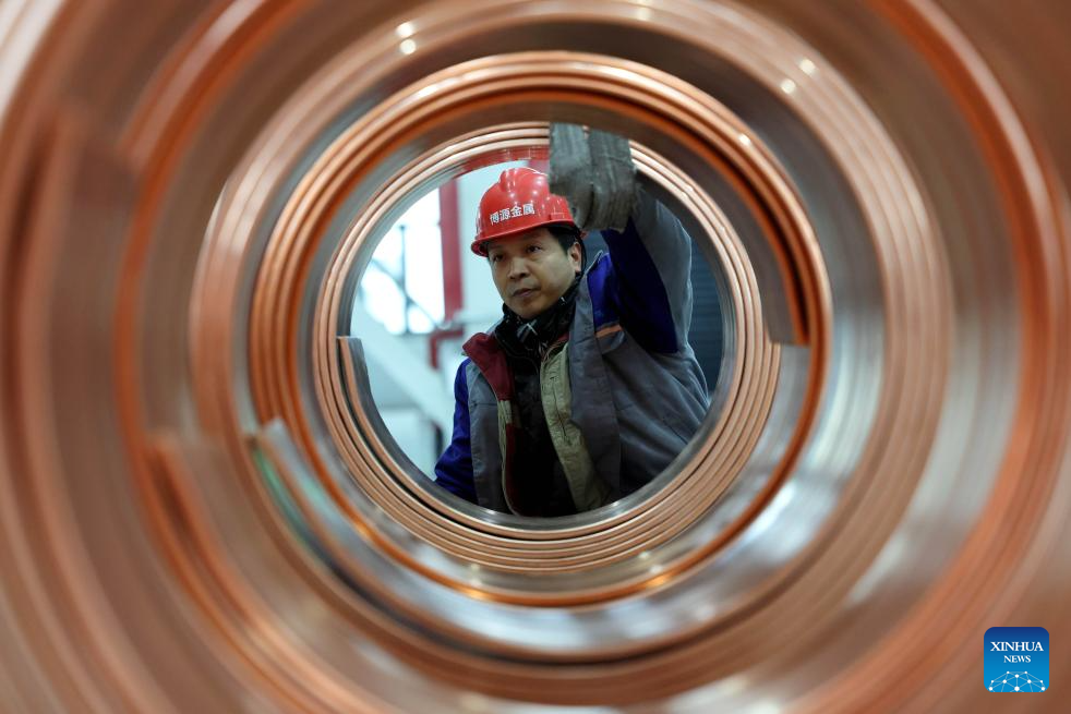 BEIJING, 19 enero, 2026 (Xinhua) -- Un trabajador prepara productos de varillas de cobre para transporte en el taller de una empresa en Huai'an, en la provincia de Jiangsu, en el este de China, el 19 de enero de 2026. El producto interno bruto (PIB) de China creció un 5 por ciento interanual en 2025, cumpliendo con el objetivo anual de alrededor del 5 por ciento, según datos oficiales publicados el lunes. El PIB de China alcanzó un récord de 140,1879 billones de yuanes (unos 20,01 billones de dólares) el año pasado, resaltó el Buró Nacional de Estadísticas. (Xinhua/Yin Chao)