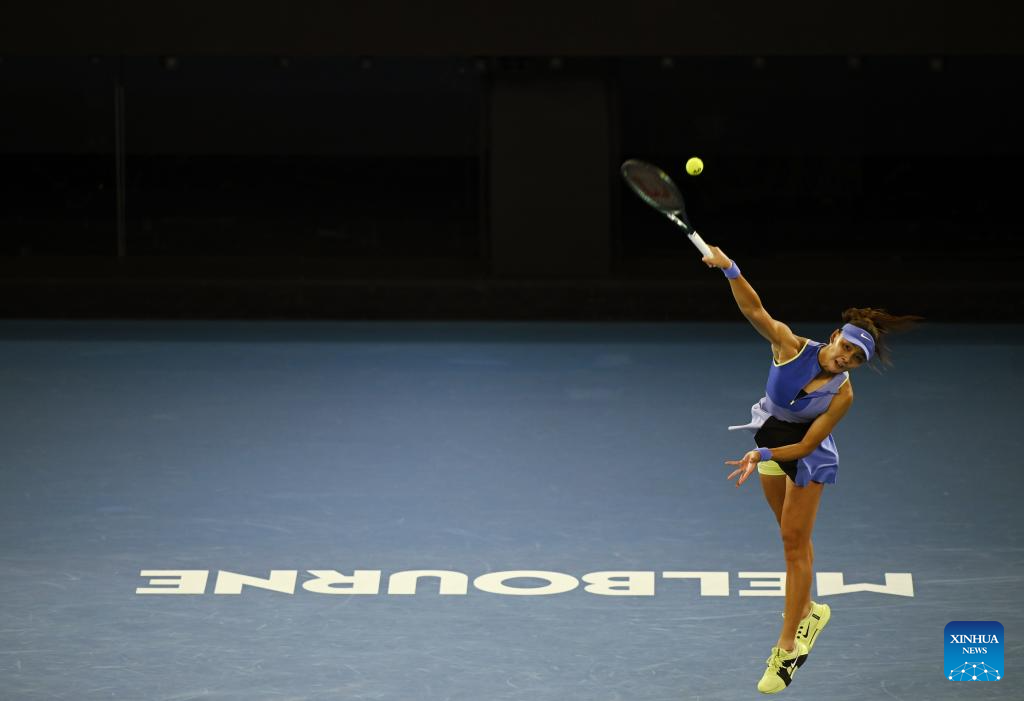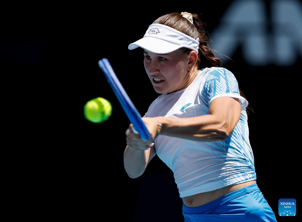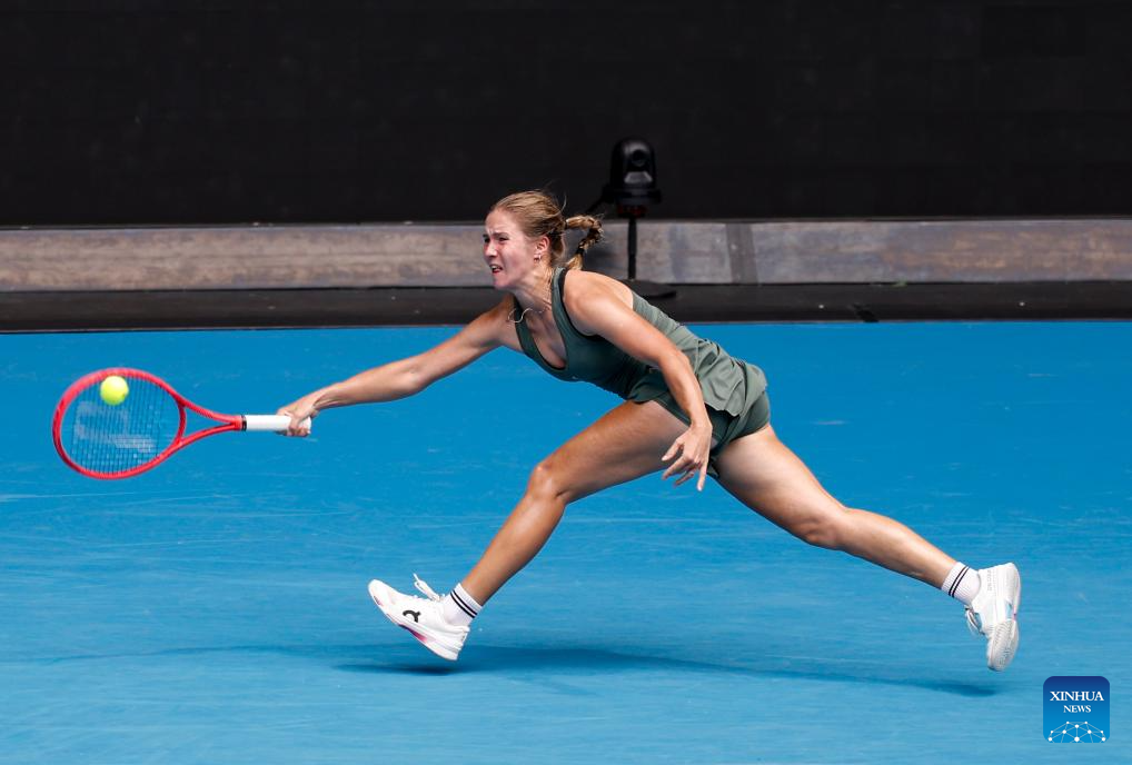 MELBOURNE, 19 enero, 2026 (Xinhua) -- Anastasia Zakharova, de Rusia, devuelve la pelota durante el partido de primera ronda de individuales femeninos, ante Jessica Pegula, de Estados Unidos, en el torneo de tenis Abierto de Australia, en Melbourne, Australia, el 19 de enero de 2026. (Xinhua/Ma Ping)