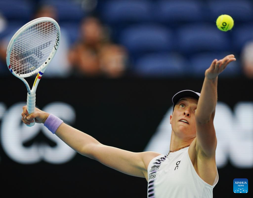 MELBOURNE, 19 enero, 2026 (Xinhua) -- Iga Swiatek sirve la pelota durante el partido de primera ronda de individuales femeninos, entre Yuan Yue, de China, e Iga Swiatek, de Polonia, en el torneo de tenis Abierto de Australia, en Melbourne, Australia, el 19 de enero de 2026. (Xinhua/Wang Shen)