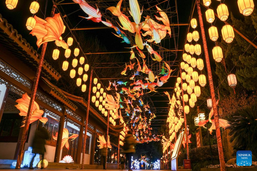 NANJING, 21 enero, 2026 (Xinhua) -- Turistas observan las decoraciones luminosas exhibidas en el Parque Bailuzhou durante el 40° Festival de Linternas de Qinhuai, en Nanjing, en la provincia de Jiangsu, en el este de China, el 21 de enero de 2026. La ceremonia de encendido del festival se celebró el miércoles en el Parque Bailuzhou. El festival se puede visitar en varias áreas de exhibición cerca del río Qinhuai en la ciudad de Nanjing. (Xinhua/Li Bo)