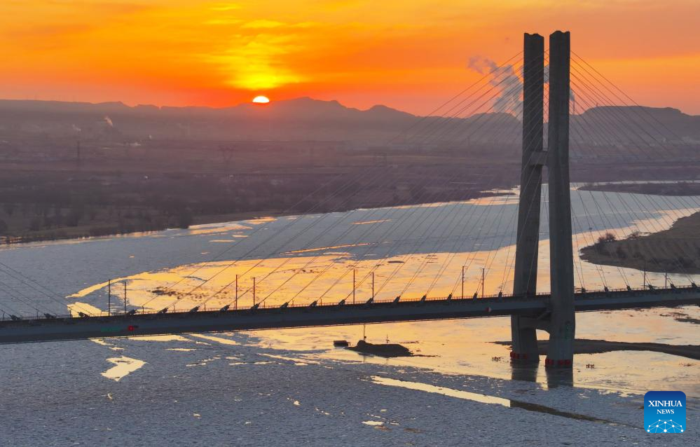 YINCHUAN, 21 enero, 2026 (Xinhua) -- Vista aérea tomada con un dron el 21 de enero de 2026 de la superficie congelada del río Amarillo a lo largo de la frontera entre la ciudad de Shizuishan de la región autónoma hui de Ningxia, en el noroeste de China, y la ciudad de Wuhai de la región autónoma de Mongolia Interior, en el norte de China, en medio de una ola de frío. (Xinhua/Yuan Hongyan)