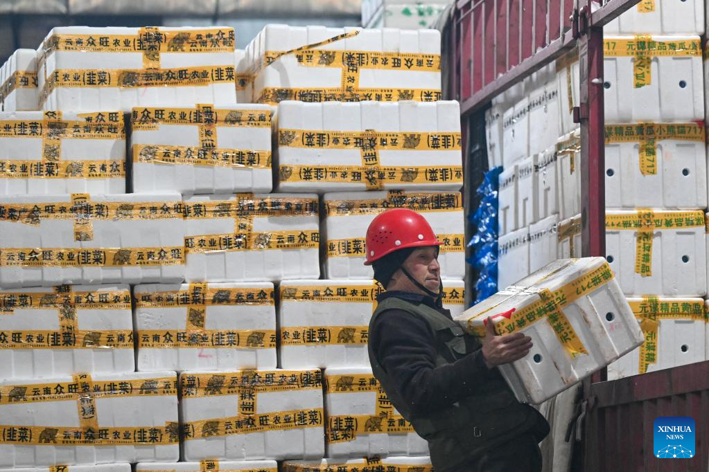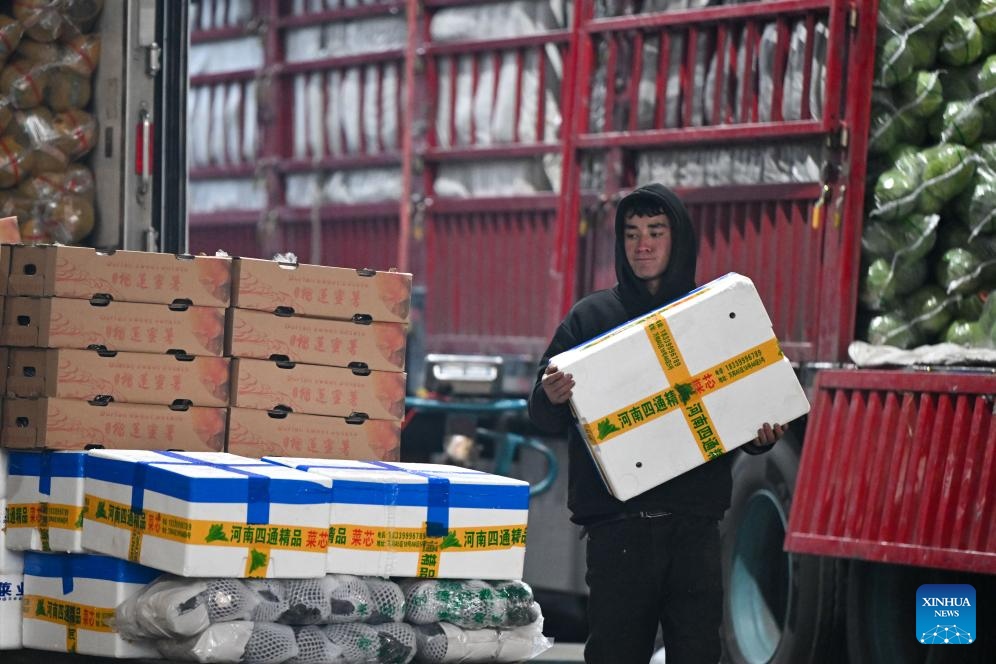 URUMQI, 21 enero, 2026 (Xinhua) -- Imagen del 19 de enero de 2026 de un vendedor transportando verduras frescas en el mercado mayorista de productos agrícolas de Jiuding, en Urumqi, en la región autónoma uygur de Xinjiang, en el noroeste de China. Una ola de frío masiva azotó recientemente la región autónoma uygur de Xinjiang, en el noroeste de China, provocando fuertes descensos de temperatura. Las autoridades de todos los sectores de la región han trabajado en coordinación para garantizar un amplio suministro de verduras y frutas. (Xinhua/Ding Lei)