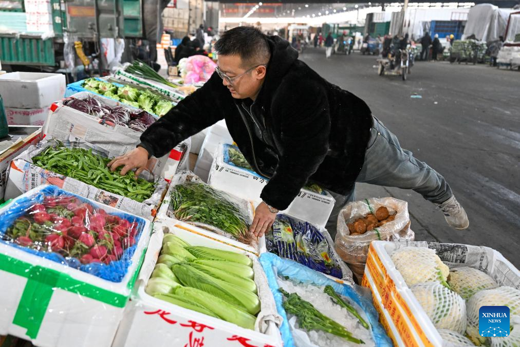 URUMQI, 21 enero, 2026 (Xinhua) -- Imagen del 19 de enero de 2026 de un vendedor acomodando verduras en el mercado mayorista de productos agrícolas de Jiuding, en Urumqi, en la región autónoma uygur de Xinjiang, en el noroeste de China. Una ola de frío masiva azotó recientemente la región autónoma uygur de Xinjiang, en el noroeste de China, provocando fuertes descensos de temperatura. Las autoridades de todos los sectores de la región han trabajado en coordinación para garantizar un amplio suministro de verduras y frutas. (Xinhua/Ding Lei)