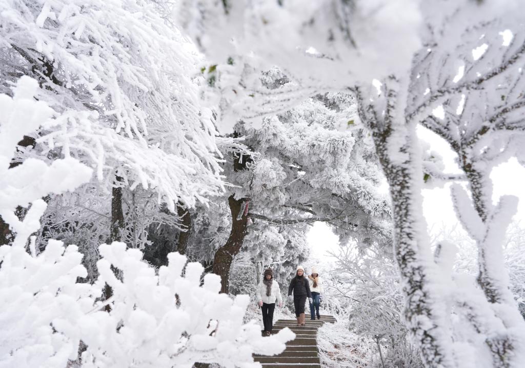 HENGYANG, 22 enero, 2026 (Xinhua) -- Turistas observan el paisaje escarchado en el punto escénico de la montaña Hengshan, en la ciudad de Hengyang, en la provincia de Hunan, en el centro de China, el 22 de enero de 2026. (Xinhua/Cao Zhengping)
