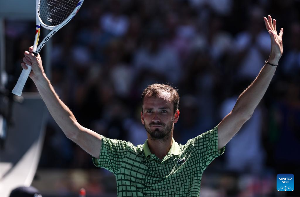 MELBOURNE, 23 enero, 2026 (Xinhua) -- Daniil Medvedev, de Rusia, festeja después de ganar el partido de tercera ronda de individuales masculinos ante Fabian Marozsan, de Hungría, en el torneo de tenis Abierto de Australia, en Melbourne, Australia, el 23 de enero de 2026. (Xinhua/Ma Ping)