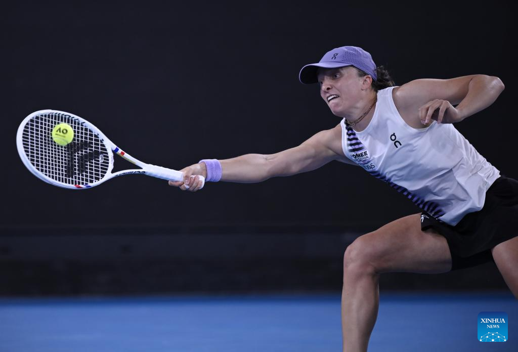 MELBOURNE, 24 enero, 2026 (Xinhua) -- Iga Swiatek devuelve la pelota durante el partido de tercera ronda de individuales femeninos entre Iga Swiatek, de Polonia, y Anna Kalinskaya, de Rusia, en el torneo de tenis Abierto de Australia, en Melbourne, Australia, el 24 de enero de 2026. (Xinhua/Wang Shen)