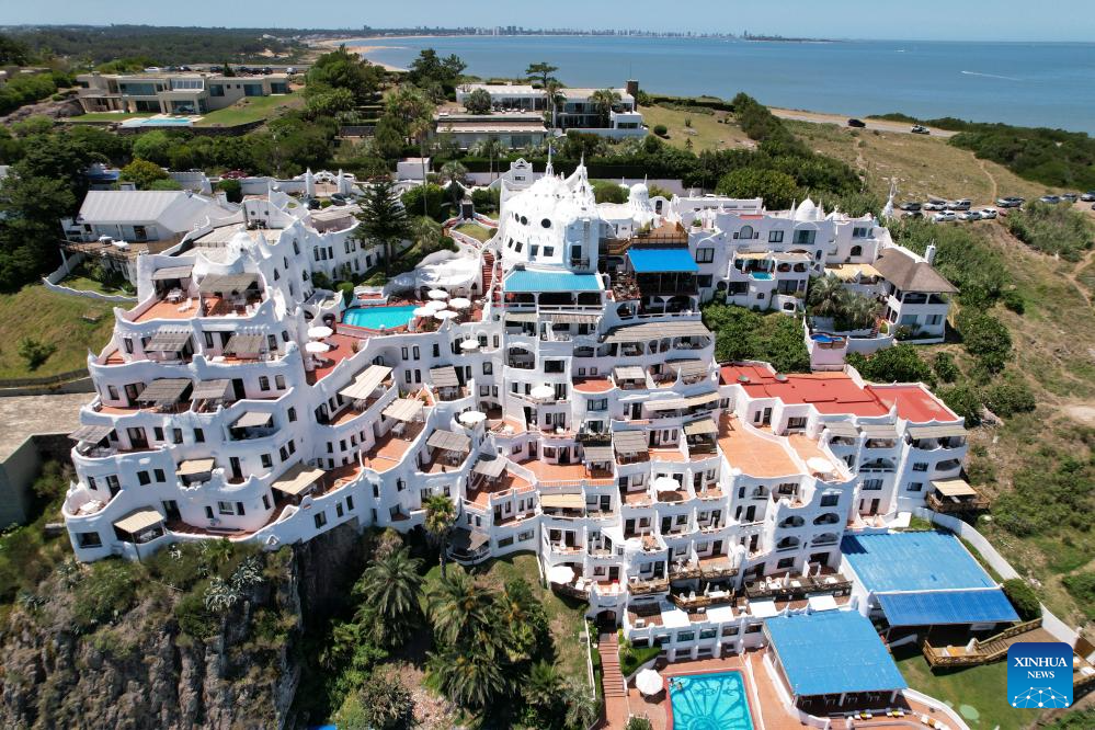 PUNTA DEL ESTE, 27 enero, 2026 (Xinhua) -- Vista aérea tomada con un dron el 24 de enero de 2026 de Casapueblo, en Punta del Este, en el departamento de Maldonado, Uruguay. En la emblemática península de Punta Ballena, frente al Río de la Plata, se alza Casapueblo. Más que una casa, es una "escultura habitable", el testamento en cemento y blanco del artista uruguayo Carlos Páez Vilaró. Desde su construcción en 1958, esta obra resumen la vocación universal de su creador. Hoy, guarda entre sus muros curvos un vínculo singular con China, forjado hace dos décadas. (Xinhua/Liu Yuchen)