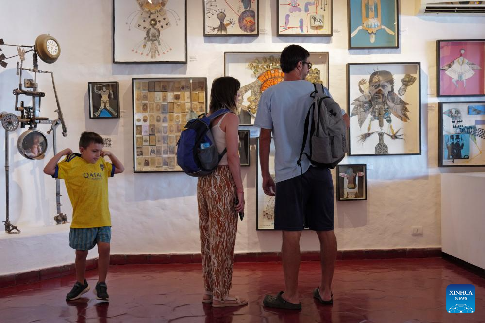 PUNTA DEL ESTE, 27 enero, 2026 (Xinhua) -- Imagen del 24 de enero de 2026 de personas observando cuadros del artista uruguayo, Carlos Páez Vilaró, en Casapueblo, en Punta del Este, en el departamento de Maldonado, Uruguay. En la emblemática península de Punta Ballena, frente al Río de la Plata, se alza Casapueblo. Más que una casa, es una "escultura habitable", el testamento en cemento y blanco del artista uruguayo, Carlos Páez Vilaró. Desde su construcción en 1958, esta obra resumen la vocación universal de su creador. Hoy, guarda entre sus muros curvos un vínculo singular con China, forjado hace dos décadas. (Xinhua/Wang Zhongyi)