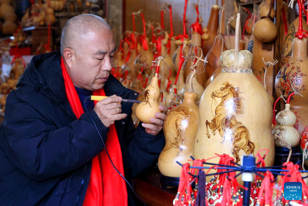 JI'NAN, 27 enero, 2026 (Xinhua) -- Imagen del 17 de enero de 2026 de un artesano realizando pirograbados con temática de caballos en calabazas, en el distrito de Jimo de Qingdao, en la provincia de Shandong, en el este de China. Con la llegada del Año del Caballo, una amplia gama de productos culturales con temas ecuestres, desde recuerdos de museos hasta artesanías tradicionales, están ganando popularidad en la provincia de Shandong, en el este de China. (Xinhua/Liang Xiaopeng)