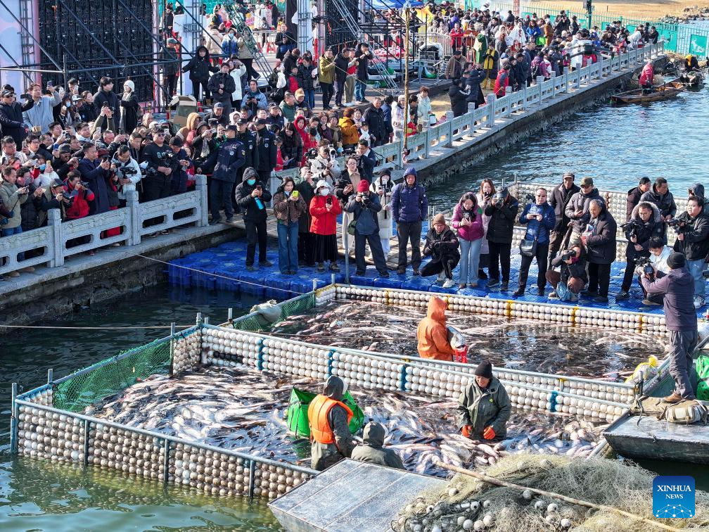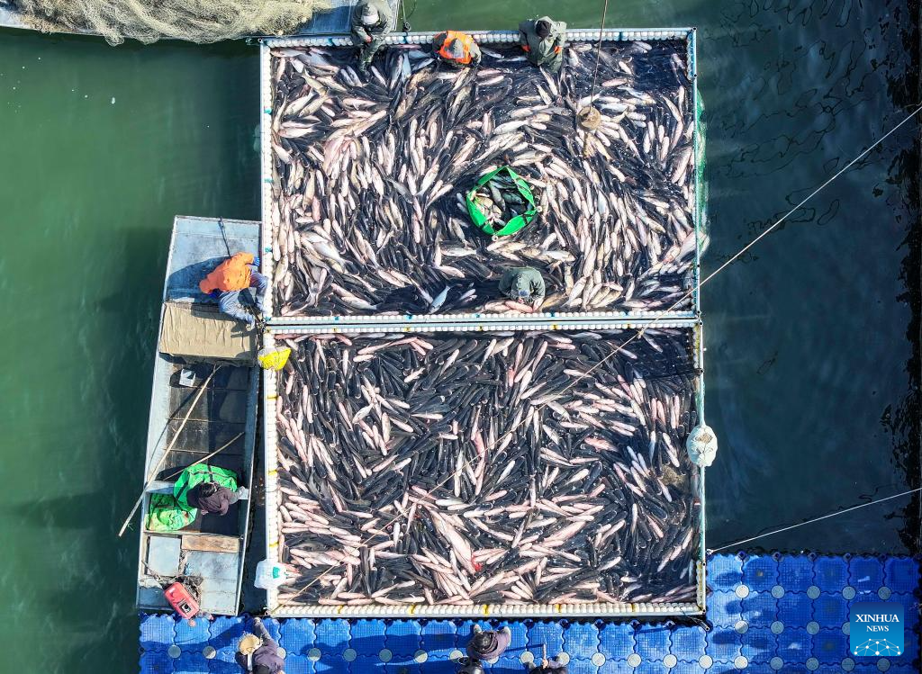 TAIZHOU, 31 enero, 2026 (Xinhua) -- Imagen tomada con un dron de pescadores capturando peces durante un evento de pesca de invierno, en Taizhou, en la provincia de Jiangsu, en el este de China, el 31 de enero de 2026. (Xinhua/Gu Jihong)