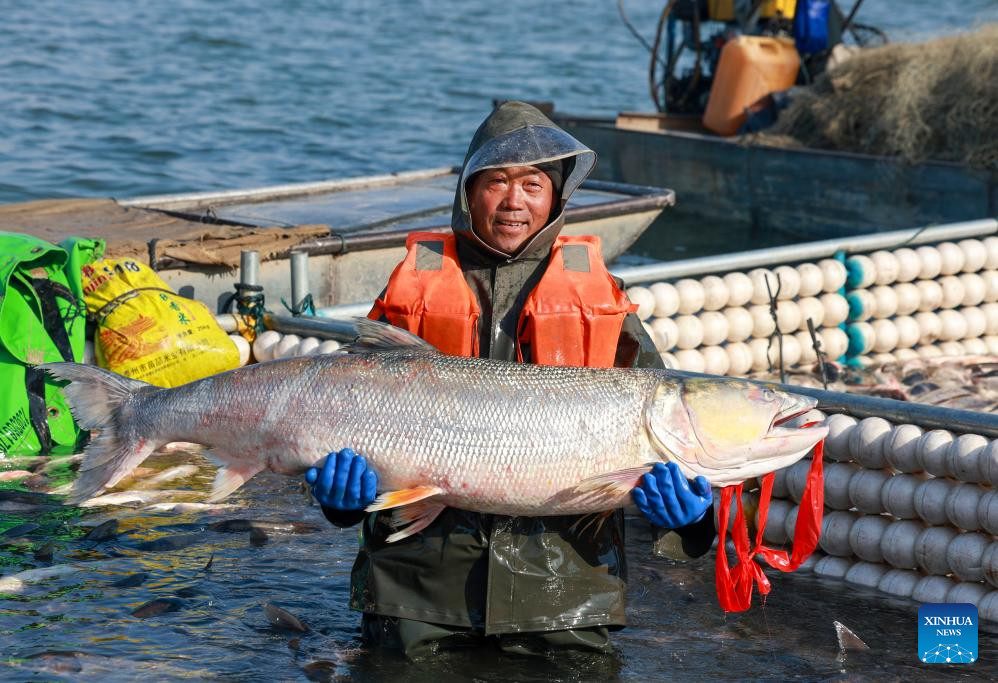 TAIZHOU, 31 enero, 2026 (Xinhua) -- Un pescador muestra un pescado recién capturado durante un evento de pesca de invierno, en Taizhou, en la provincia de Jiangsu, en el este de China, el 31 de enero de 2026. (Xinhua/Gu Jihong)