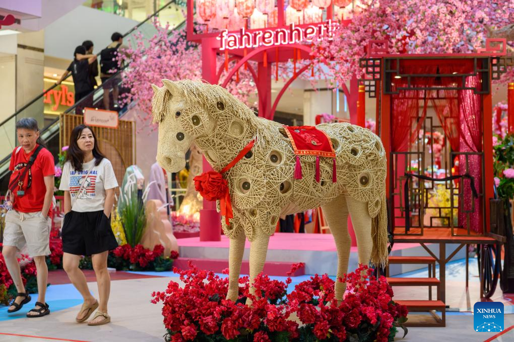 KUALA LUMPUR, 31 enero, 2026 (Xinhua) -- Imagen del 28 de enero de 2026 de personas caminando frente a una instalación con temática ecuestre para celebrar el Año del Caballo en un centro comercial, en Kuala Lumpur, Malasia. Recientemente se han montado instalaciones y decoraciones con temática de caballos para celebrar el próximo Año Nuevo chino en los principales centros comerciales de Malasia. (Xinhua/Chong Voon Chung)
