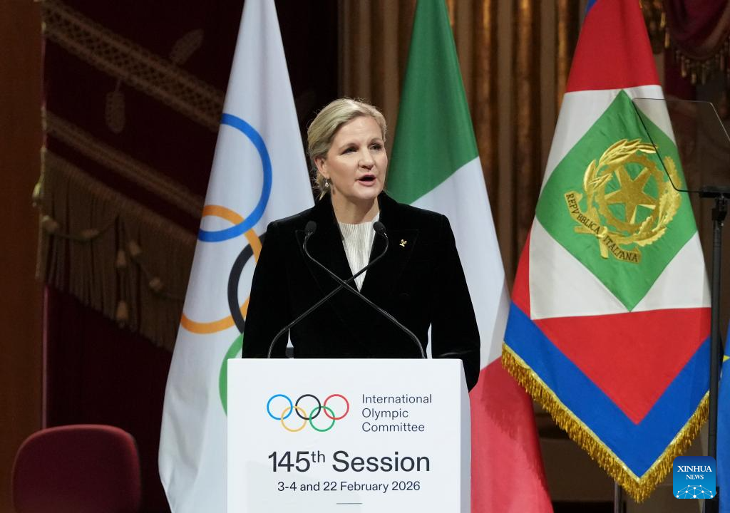 MILAN, 2 febrero, 2026 (Xinhua) -- La presidenta del Comité Olímpico Internacional (COI), Kirsty Coventry, pronuncia un discurso durante la ceremonia de apertura de la Sesión 145 del COI, en el Teatro La Scala, en Milán, Italia, el 2 de febrero de 2026. (Xinhua/Sun Fei)