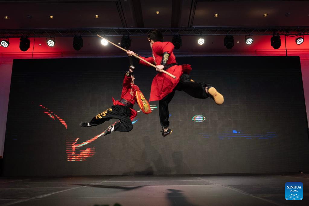 Imagen del 3 de febrero de 2026 de artistas marciales realizando una demostración de Wushu durante la recepción llevada a cabo en el marco de las celebraciones del Año Nuevo chino o Festival de la Primavera, en la ciudad de Buenos Aires, capital de Argentina. La ciudad de Buenos Aires fue escenario el martes de una velada dedicada a las expresiones artísticas y las tradiciones de China, organizada por la Embajada de China en Argentina con motivo de la próxima llegada del Año Nuevo chino del calendario lunar y el signo del Caballo del horóscopo tradicional chino. (Xinhua/Martín Zabala)