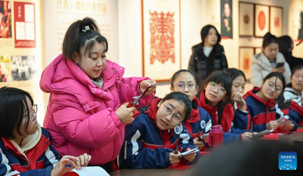 HOHHOT, 4 febrero, 2026 (Xinhua) -- Niu Chunxia (2-i), heredera representativa del cortado de papel de Horinger, muestra sus habilidades de corte de papel a estudiantes en una sala de exposiciones del Parque del Sitio Arqueológico Tuchengzi de Horinger, en el distrito de Horinger, en la región autónoma de Mongolia Interior, en el norte de China, el 4 de febrero de 2026. Eventos dedicados la artesanía tradicional del cortado de papel de Horinger, un patrimonio cultural inmaterial nacional, se llevaron a cabo en el distrito de Horinger el miércoles para conmemorar el "Lichun", o el Comienzo de la Primavera, el primero de los 24 términos solares del calendario lunar chino, y para dar la bienvenida al próximo Festival de la Primavera. (Xinhua/Bei He)