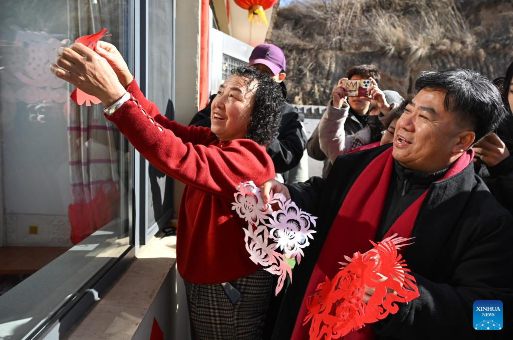 HOHHOT, 4 febrero, 2026 (Xinhua) -- Duan Jianjun (d-frente), representante nacional y heredero del arte del cortado de papel de Horinger, pega obras de cortado de papel en una ventana junto a lugareños, en la aldea de Taigedou del distrito de Horinger, en la región autónoma de Mongolia Interior, en el norte de China, el 4 de febrero de 2026. Eventos dedicados la artesanía tradicional del cortado de papel de Horinger, un patrimonio cultural inmaterial nacional, se llevaron a cabo en el distrito de Horinger el miércoles para conmemorar el "Lichun", o el Comienzo de la Primavera, el primero de los 24 términos solares del calendario lunar chino, y para dar la bienvenida al próximo Festival de la Primavera. (Xinhua/Bei He)