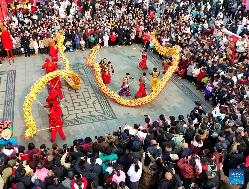 BEIJING, 4 febrero, 2026 (Xinhua) -- Vista aérea tomada con un dron el 4 de febrero de 2026 de personas observando una danza del dragón con motivo del "Lichun", en Nanyang, en la provincia de Henan, en el centro de China. El miércoles se conmemora el "Lichun", o el Comienzo de la Primavera, el primero de los 24 términos solares del calendario lunar chino. (Xinhua/Gao Song)