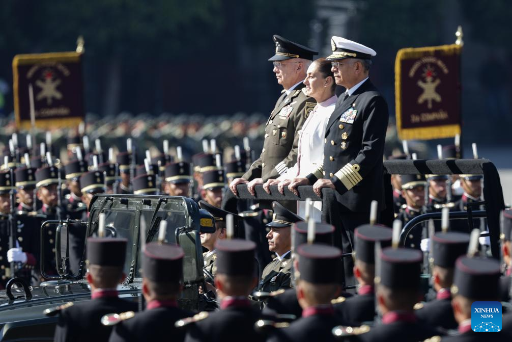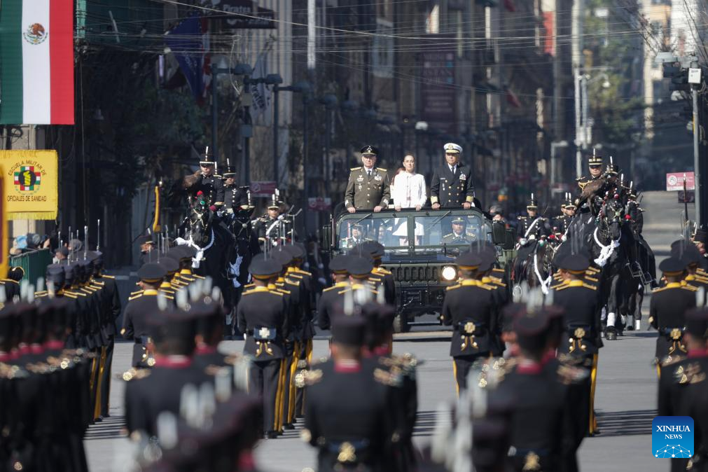 CIUDAD DE MEXICO, 9 febrero, 2026 (Xinhua) -- La presidenta mexicana, Claudia Sheinbaum (c), asiste a los actos conmemorativos por el 113 Aniversario de la Marcha de la Lealtad, en el Zócalo de la Ciudad de México, capital de México, el 9 de febrero de 2026. (Xinhua/Francisco Cañedo)