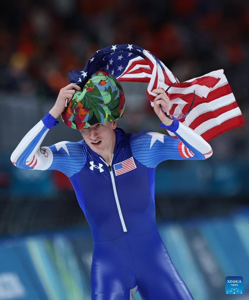 MILAN, 11 febrero, 2026 (Xinhua) -- Jordan Stolz, de Estados Unidos, festeja al término de los 1.000m masculinos de patinaje de velocidad en los Juegos Olímpicos de Invierno Milán-Cortina 2026, en Milán, Italia, el 11 de febrero de 2026. (Xinhua/Li Jing)