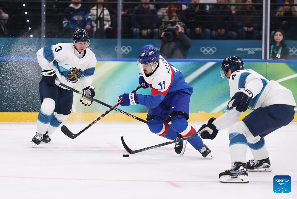 MILAN, 11 febrero, 2026 (Xinhua) -- Milos Kelemen (c), de Eslovaquia, se abre paso durante el partido del grupo B de la ronda preliminar masculina entre Finlandia y Eslovaquia de hockey sobre hielo en los Juegos Olímpicos de Invierno Milán-Cortina 2026, en Milán, Italia, el 11 de febrero de 2026. (Xinhua/Wang Kaiyan)