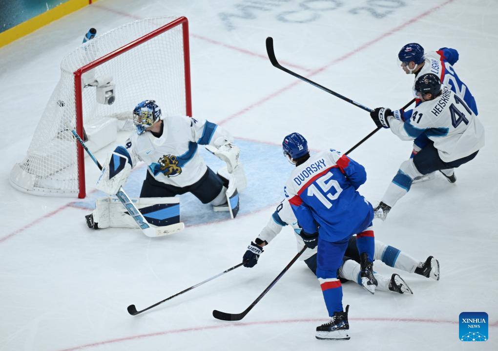 MILAN, 11 febrero, 2026 (Xinhua) -- Dalibor Dvorsky (abajo), de Eslovaquia, anota durante el partido del grupo B de la ronda preliminar masculina entre Finlandia y Eslovaquia de hockey sobre hielo en los Juegos Olímpicos de Invierno Milán-Cortina 2026, en Milán, Italia, el 11 de febrero de 2026. (Xinhua/Zhang Haofu)
