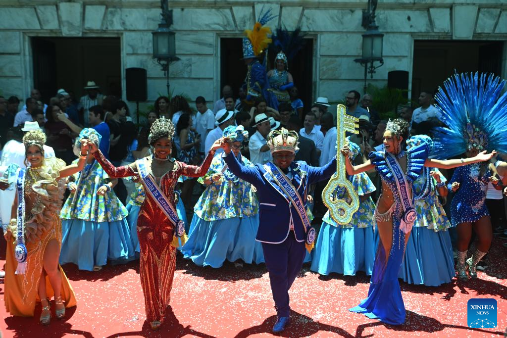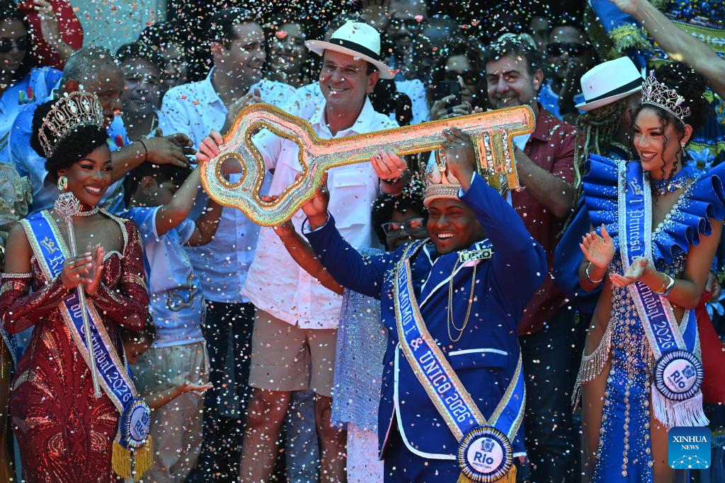 El alcalde de Río de Janeiro, Eduardo Paes (c-atrás), entrega las llaves de la ciudad al rey Momo del Carnaval, Danilo Vieira (d-frente), en la ceremonia de inauguración de la temporada de Carnaval 2026, en Río de Janeiro, Brasil, el 13 de febrero de 2026. La temporada de Carnaval 2026 en Brasil tendrá un impacto económico calculado en 18.600 millones de reales (unos 3.720 millones de dólares), lo que significará 10 por ciento más frente al mismo período del año anterior y el mejor resultado para el período desde el inicio de la serie histórica en 2011, según estimaciones del Gobierno y del sector privado. (Xinhua/Lucio Tavora)