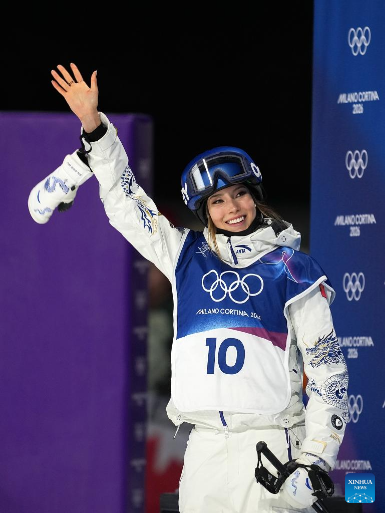 LIVIGNO, 14 febrero, 2026 (Xinhua) -- Gu Ailing, de China, saluda durante la clasificación de Big Air femenino de esquí acrobático en los Juegos Olímpicos de Invierno Milán-Cortina 2026, en Livigno, Italia, el 14 de febrero de 2026. (Xinhua/Hu Chao)