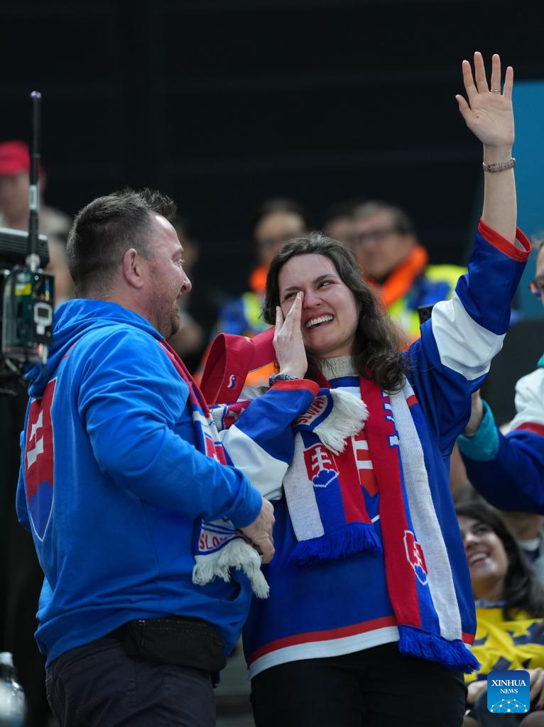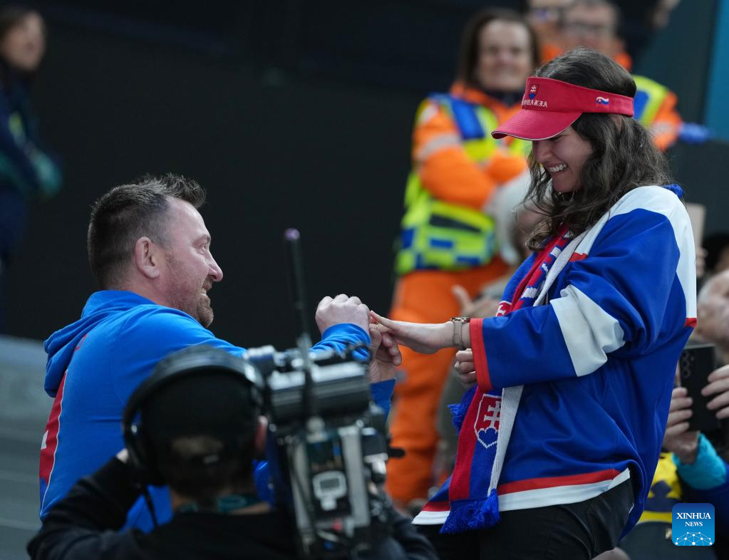 MILAN, 14 febrero, 2026 (Xinhua) -- Un aficionado eslovaco le pide matrimonio a su novia durante el partido del grupo B de la ronda preliminar masculina entre Suecia y Eslovaquia de hockey sobre hielo en los Juegos Olímpicos de Invierno Milán-Cortina 2026, en Milán, Italia, el 14 de febrero de 2026. (Xinhua/Tao Xiyi)