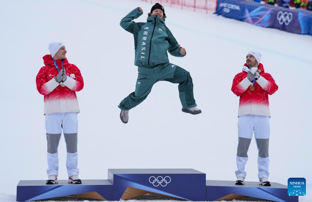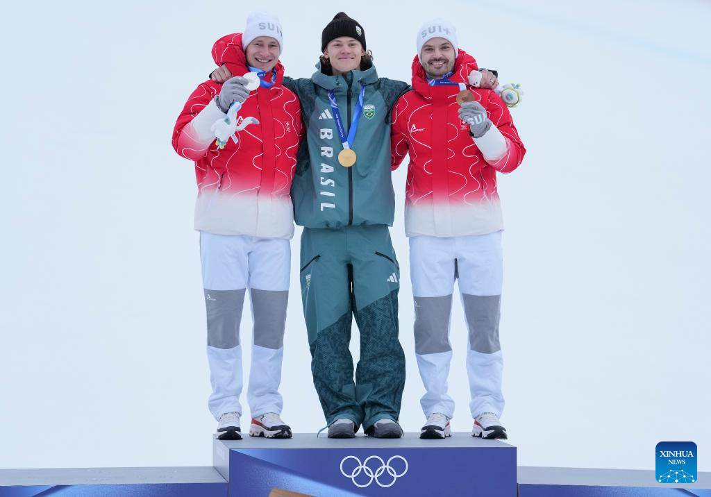 BORMIO, 14 febrero, 2026 (Xinhua) -- El medallista de oro Lucas Pinheiro Braathen (c), de Brasil, el medallista de plata Marco Odermatt (i), de Suiza, y el medallista de bronce Loic Meillard, de Suiza, posan para fotografías durante la ceremonia de premiación del evento de eslalon gigante masculino de esquí alpino en los Juegos Olímpicos de Invierno Milán-Cortina 2026, en Bormio, Italia, el 14 de febrero de 2026. (Xinhua/Hu Huhu)