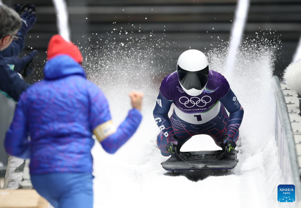 CORTINA D'AMPEZZO, 14 febrero de 2026 (Xinhua) -- Imagen del 13 de febrero de 2026 de Christopher Grotheer, de Alemania, reaccionando tras cruzar la línea de meta durante la serie 4 de la competencia de skeleton masculino en los Juegos Olímpicos de Invierno Milán-Cortina 2026, en Cortina, Italia. (Xinhua/Ding Xu)