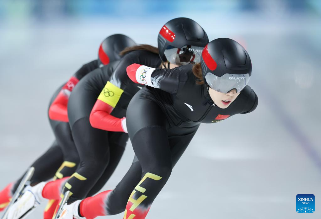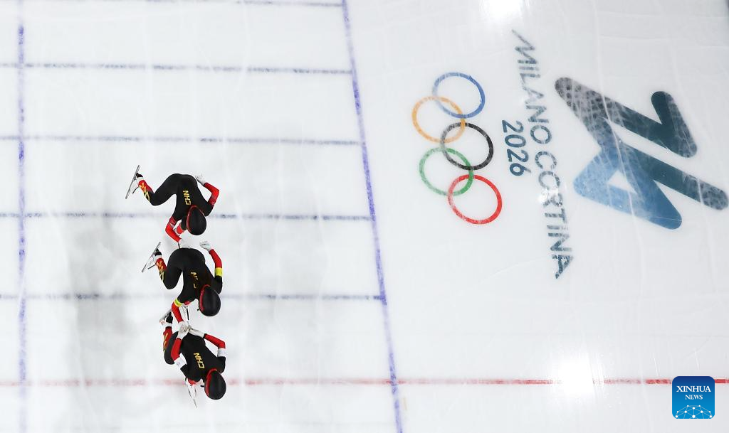 MILAN, 14 febrero, 2026 (Xinhua) -- Atletas del equipo de China compiten durante los cuartos de final de persecución por equipos femenino de patinaje de velocidad en los Juegos Olímpicos de Invierno Milán-Cortina 2026, en Milán, Italia, el 14 de febrero de 2026. (Xinhua/Du Xiaoyi)