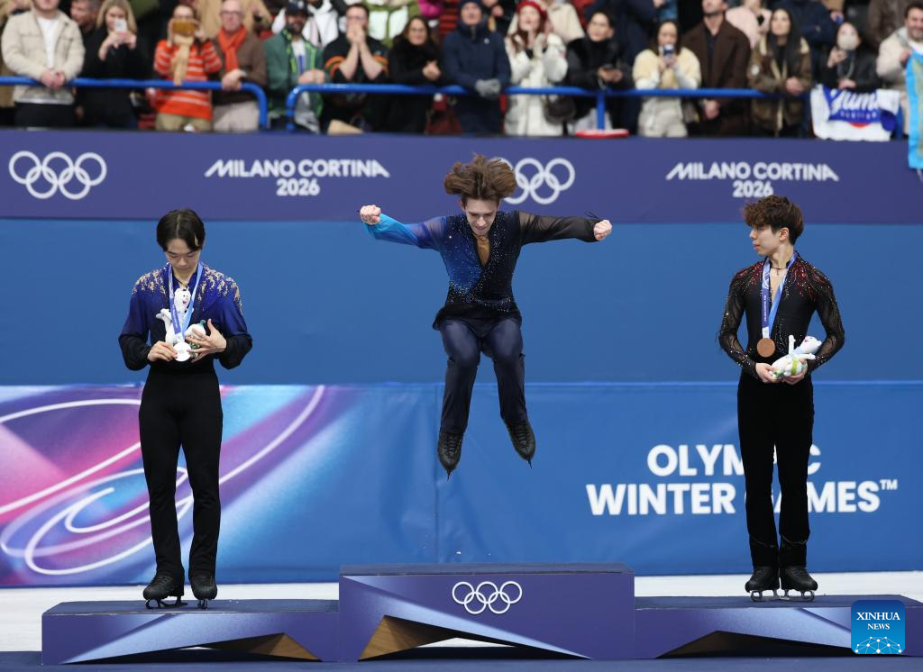 MILAN, 14 febrero, 2026 (Xinhua) -- Imagen del 13 de febrero de 2026 del medallista de oro Mikhail Shaidorov (c), de Kazajistán, festejando en el podio al término del programa libre de patinaje individual masculino de patinaje artístico en los Juegos Olímpicos de Invierno Milán-Cortina 2026, en Milán, Italia. (Xinhua/Li Ming)