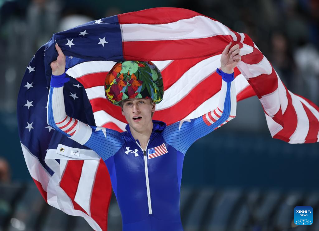 MILAN, 14 febrero, 2026 (Xinhua) -- Jordan Stolz, de Estados Unidos, festeja al término de la final de 500m masculinos de patinaje de velocidad en los Juegos Olímpicos de Invierno Milán-Cortina 2026, en Milán, Italia, el 14 de febrero de 2026. (Xinhua/Li Jing)