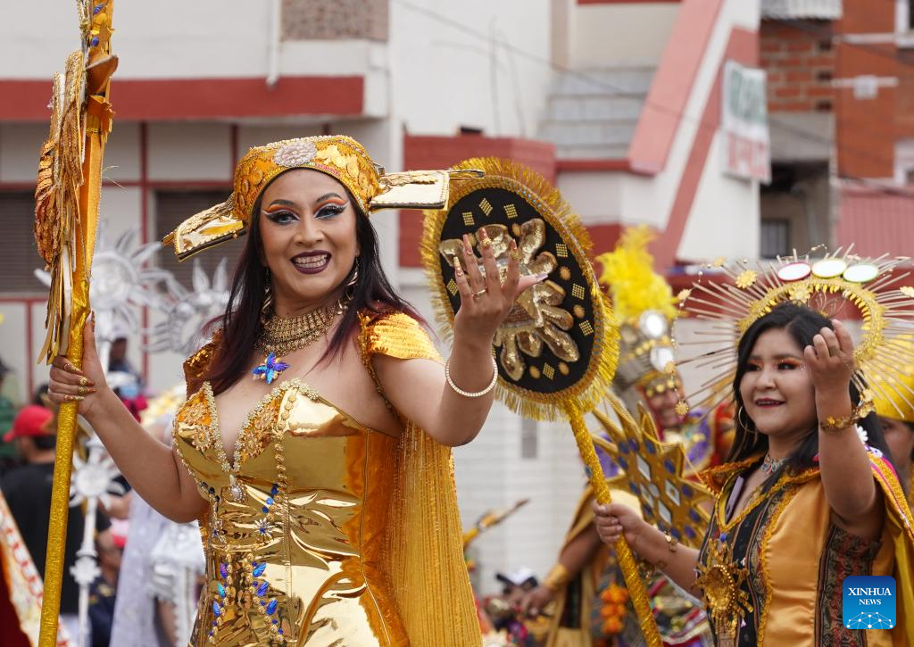 ORURO, 14 febrero, 2026 (Xinhua) -- Integrantes de la Fraternidad Hijos del Sol participan en el Carnaval de Oruro, en la ciudad de Oruro, Bolivia, el 14 de febrero de 2026. (Xinhua/Javier Mamani)