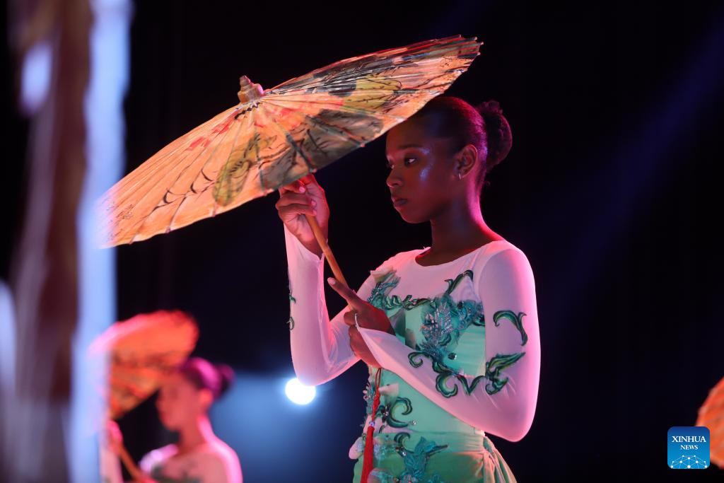 PRAIA, 15 febrero, 2026 (Xinhua) -- Imagen del 14 de febrero de 2026 de una artista bailando durante una gala del Año Nuevo chino en el Auditorio Nacional, en Praia, capital de Cabo Verde. (Xinhua/Elton Monteiro)