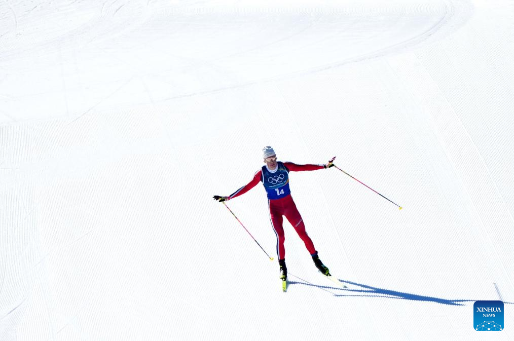 TESERO, 15 febrero, 2026 (Xinhua) -- Johannes Hoesflot Klaebo, de Noruega, festeja al término del relevo 4x7,5 km masculino de esquí de fondo en los Juegos Olímpicos de Invierno Milán-Cortina 2026, en Tesero, Italia, el 15 de febrero de 2026. (Xinhua/Peng Ziyang)