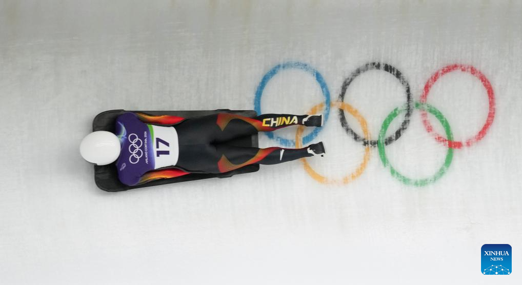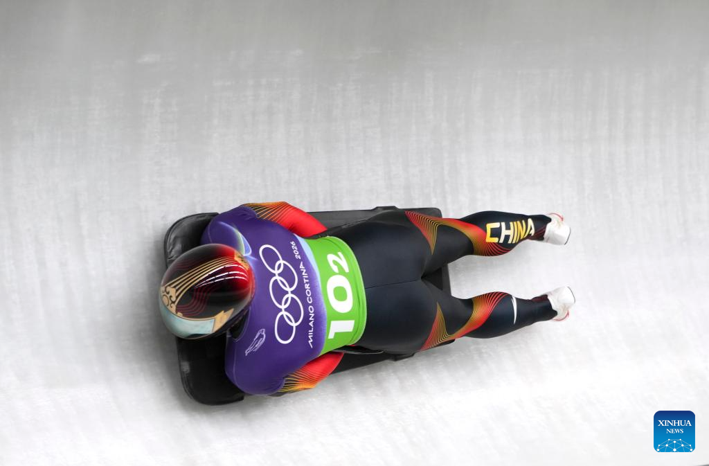 CORTINA D'AMPEZZO, 15 febrero, 2026 (Xinhua) -- Imagen del 14 de febrero de 2026 de Zhao Dan, de China, compitiendo durante la serie de skeleton femenino en los Juegos Olímpicos de Invierno Milán-Cortina 2026, en Cortina, Italia. (Xinhua/Ding Xu)