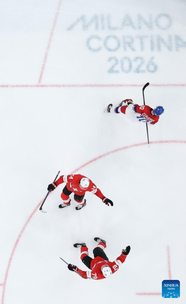 MILAN, 15 febrero, 2026 (Xinhua) -- Roman Cervenka, de República Checa, pasa junto a jugadores de Suiza después de perder el partido de la ronda preliminar del grupo A entre Suiza y República Checa en los Juegos Olímpicos de Invierno Milán-Cortina 2026, en Milán, Italia, el 15 de febrero de 2026. (Xinhua/Tao Xiyi)