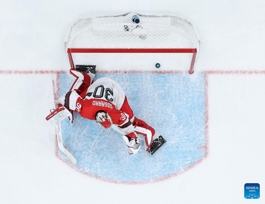 MILAN, 15 febrero, 2026 (Xinhua) -- Lukas Dostal (3-i), de República Checa, falla al atajar el disco durante el partido de la ronda preliminar del grupo A entre Suiza y República Checa en los Juegos Olímpicos de Invierno Milán-Cortina 2026, en Milán, Italia, el 15 de febrero de 2026. (Xinhua/Tao Xiyi)