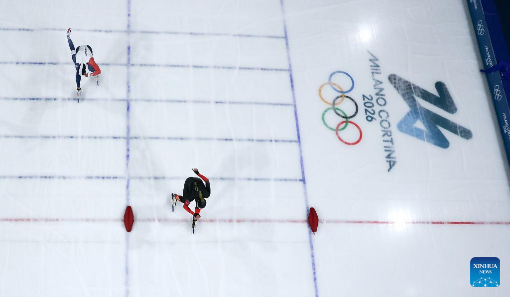 MILAN, 15 febrero, 2026 (Xinhua) -- Imagen del 14 de febrero de 2026 de Gao Tingyu (d), de China, cruzando la línea de meta durante la final de 500 m masculina de patinaje de velocidad en los Juegos Olímpicos de Invierno Milán-Cortina 2026, en Milán, Italia. (Xinhua/Du Xiaoyi)