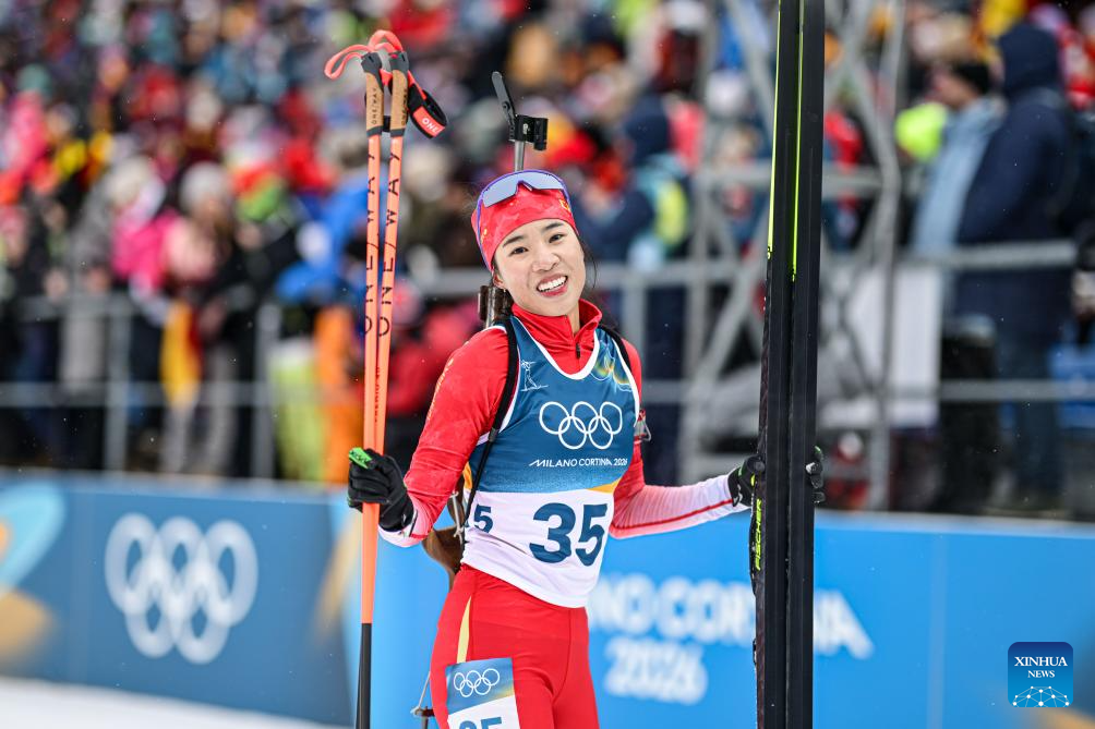 ANTERSELVA, 15 febrero, 2026 (Xinhua) -- Imagen del 14 de febrero de 2026 de Chu Yuanmeng, de China, reaccionando al término del esprint de 7.5 km femenino de biatlón en los Juegos Olímpicos de Invierno Milán-Cortina 2026, en Anterselva, Italia. (Xinhua/Jiang Han)