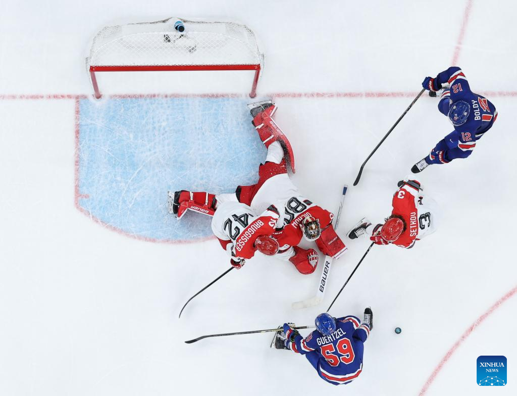 MILAN, 15 febrero, 2026 (Xinhua) -- Imagen del 14 de febrero de 2026 de jugadores compitiendo durante el partido del grupo C de la ronda preliminar masculina entre Estados Unidos y Dinamarca de hockey sobre hielo en los Juegos Olímpicos de Invierno Milán-Cortina 2026, en Milán, Italia. (Xinhua/Zhang Haofu)